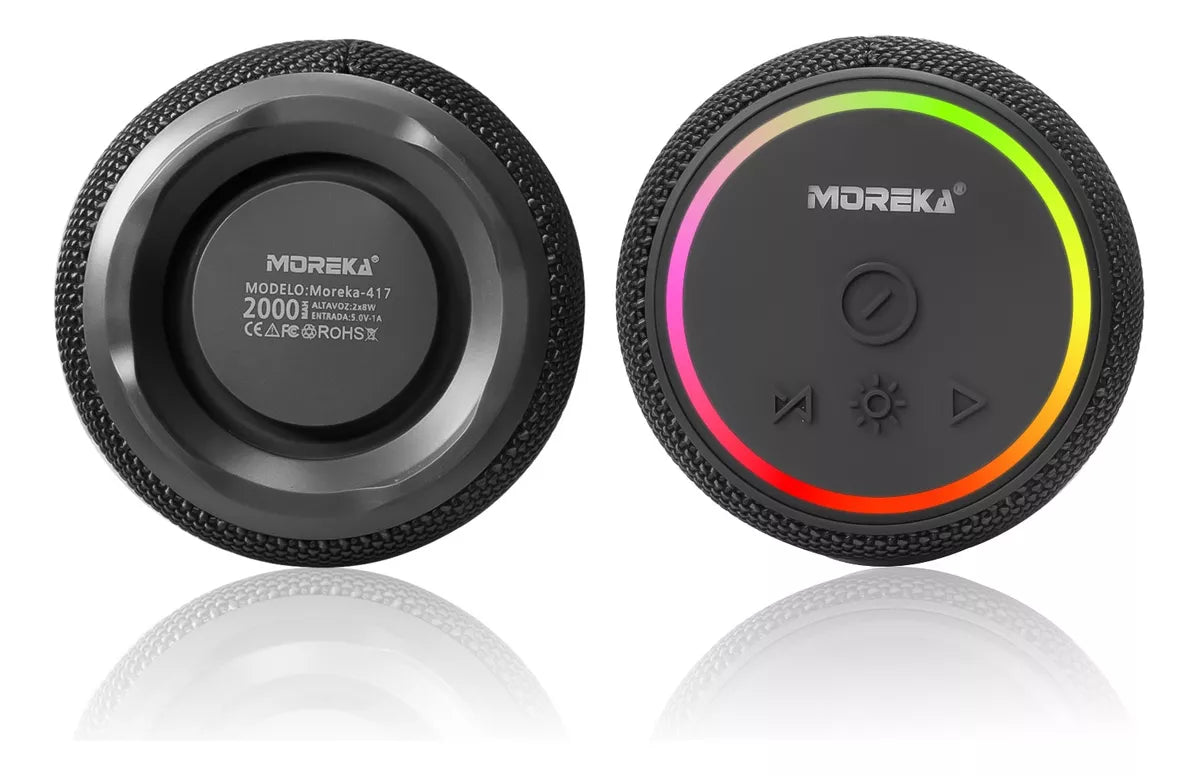 Disfruta de un sonido envolvente y potente con la bocina Bluetooth Moreka M417. Diseñada para ofrecer una experiencia de audio premium con 16W de potencia, luces LED dinámicas y un diseño portátil ideal para cualquier ocasión. ¡Llévala a todas partes y haz que tu música cobre vida!