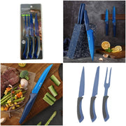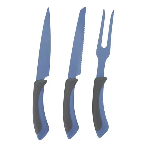 - Incluye: 3 piezas (cuchillo chef, cuchillo serrado y tenedor).