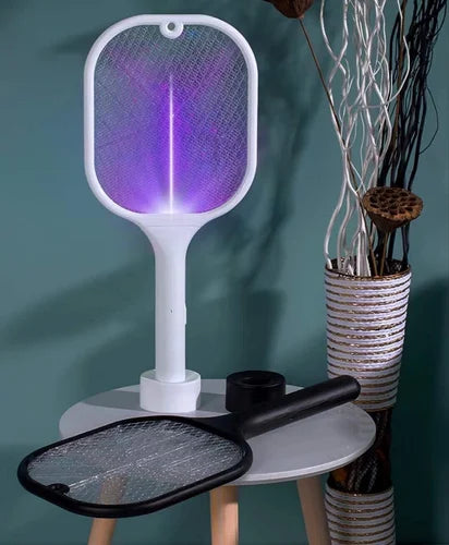 Elimina mosquitos de forma inmediata con esta raqueta eléctrica multifuncional. Ideal para interiores o exteriores, cuenta con batería recargable por USB y base para mantenerla de pie cuando no se usa. Además, su luz UV incorporada atrae insectos incluso en la oscuridad.