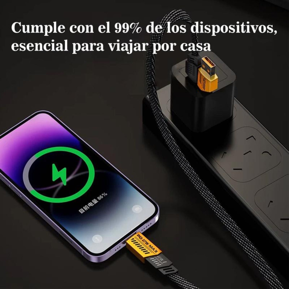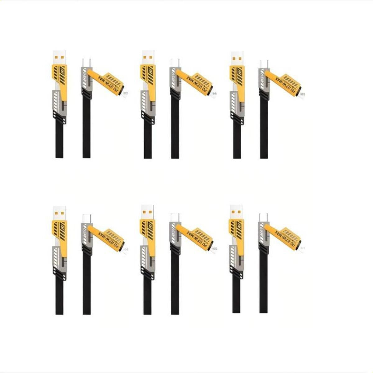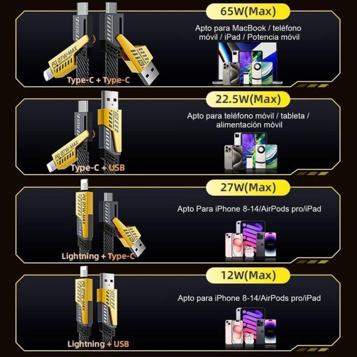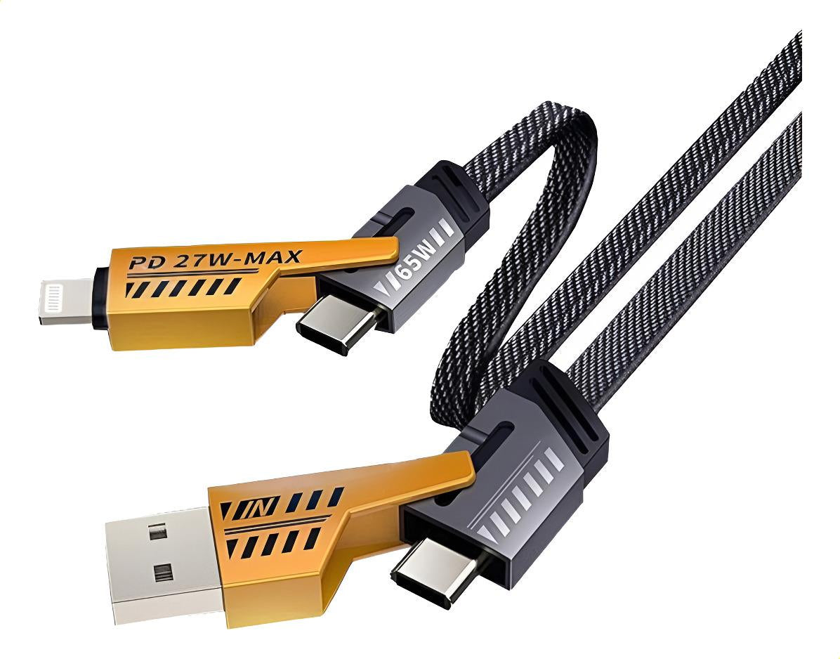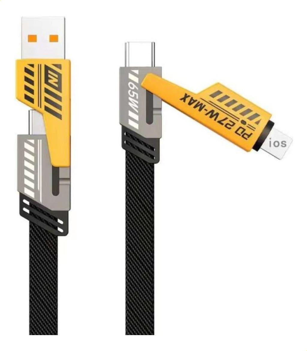 Compatibilidad Universal : Cable 4 en 1 compatible con cable iphone y cable tipo c carga rapida, ideal para smartphones, tablets y laptops con carga rápida y eficiente Diseño Reforzado : Fabricado con materiales resistentes para mayor durabilidad, perfecto para cable usb c y cable tipo c, asegurando conexiones estables y seguras Rendimiento Optimizado : Tecnología de carga rápida que reduce el tiempo de espera, compatible con cable usb de 30 metros y otros dispositivos, haciendo tu día más productivo con un toque de humor Versatilidad y Practicidad : Ideal para cable tipo c iphone y cable usb iphone, este cable es tu mejor aliado para viajes, oficina o hogar, con un diseño colorido que alegra tu rutina Calidad Garantizada : Producto confiable para cable para iphone y cables usb tipo c, ofreciendo transferencia de datos y carga simultánea con garantía de satisfacción Descripción del producto: Este cable USB 4 en 1 es la solución perfecta para todos tus dispositivos. Con compatibilidad con cable iphone y cable tipo c carga rapida, ofrece carga rápida y eficiente para smartphones, tablets, laptops y más. Su diseño reforzado y colores vibrantes (negro y amarillo) lo hacen duradero y divertido, ideal para el uso diario. Ya sea en casa, oficina o viaje, este cable asegura conexiones estables y seguras, haciendo tu vida más fácil con un toque de humor. Además, es compatible con cable usb c y cable tipo c, proporcionando versatilidad y rendimiento superior. Especificaciones: Dimensiones: Longitud de 1 metro Material: Nylon reforzado y conectores de metal Contenido del paquete: 1 cable reforzado 4 en 1