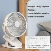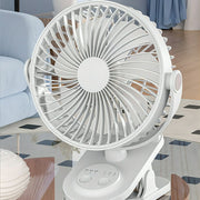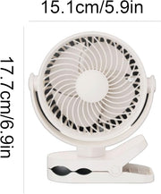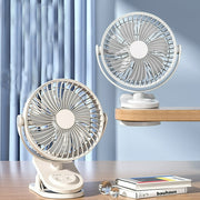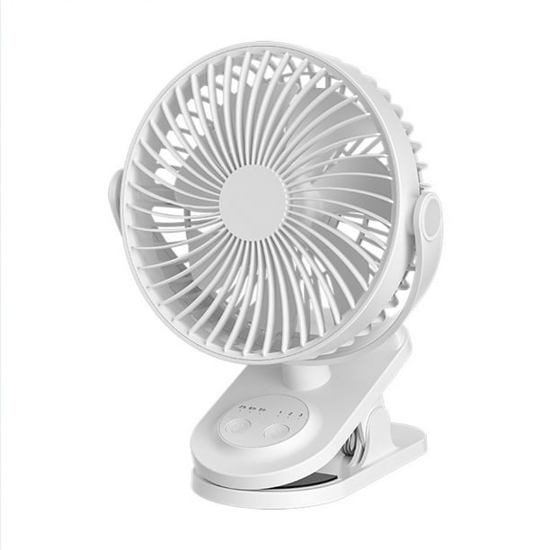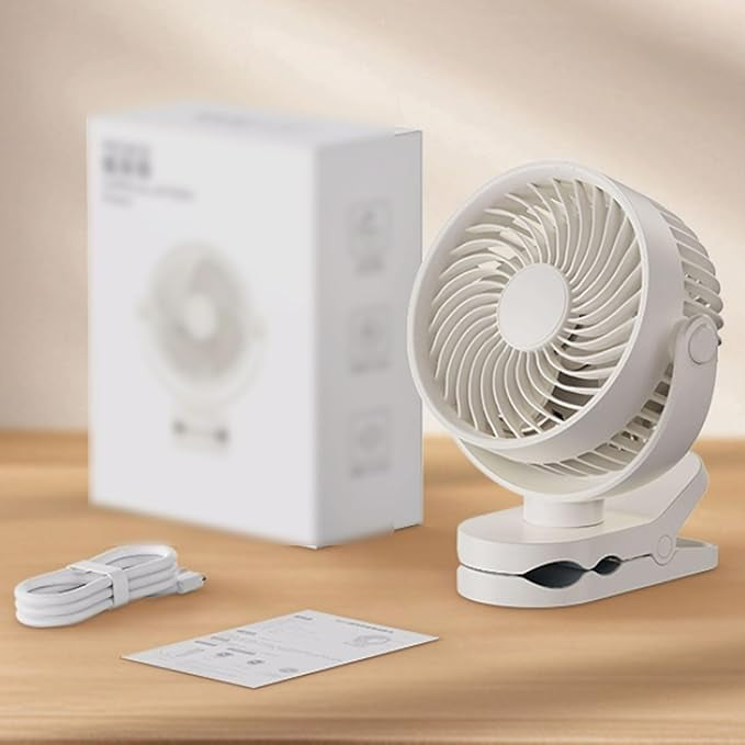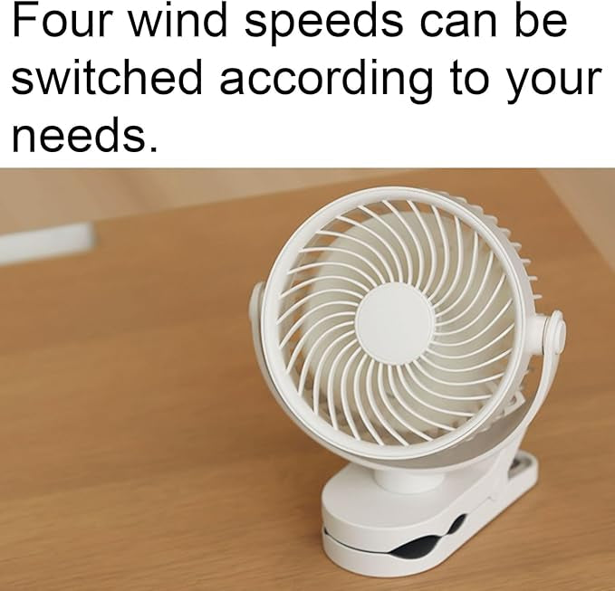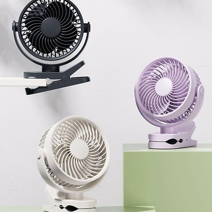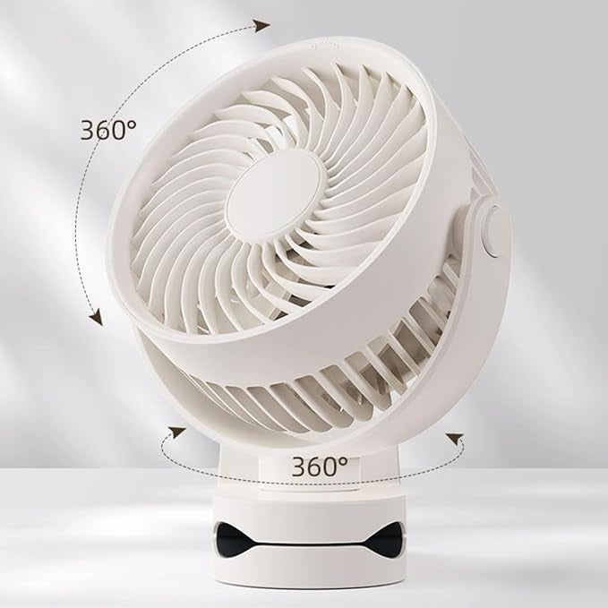 - Este ventilador portátil está hecho de plástico y puede girar 360 ° hacia arriba, hacia abajo, izquierda y derecha.