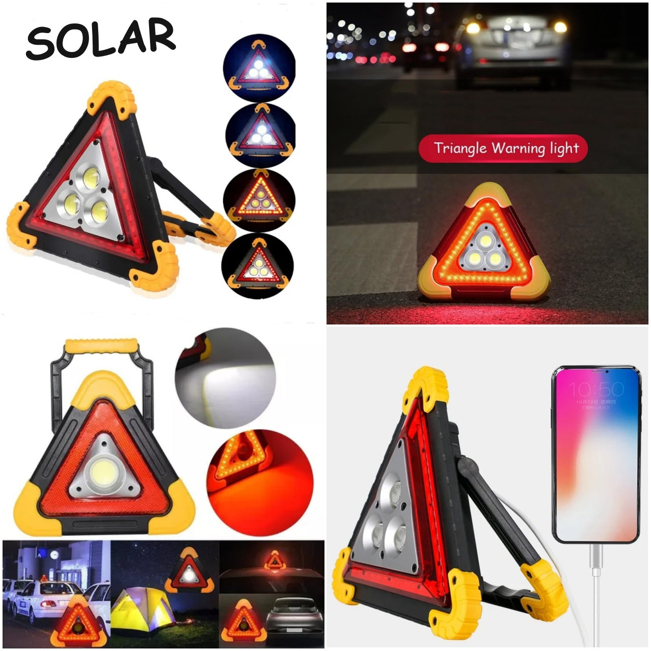 Una luz de advertencia en forma de triángulo diseñada para emergencias viales, campamentos y más. Funciona con energía solar y batería recargable, ofreciendo gran autonomía y versatilidad.